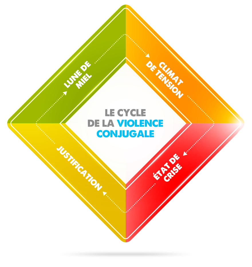 La violence conjugale se distingue des autres formes de violence par le fait qu’elle se manifeste dans une relation amoureuse où un.e des partenaires installe et maintient un rapport de domination et de contrôle sur l’autre. La violence est un moyen utilisé dans le but d’obtenir le pouvoir sur sa partenaire. On y retrouve donc l’intention de contrôler. C’est par la répétition cyclique et différentes stratégies de contrôle (ou de formes de violence), en alternant des périodes de lune de miel, de tension et de justification que l’agresseur maintient son emprise et s’assure ainsi que la victime ne mettra pas fin à la relation.
